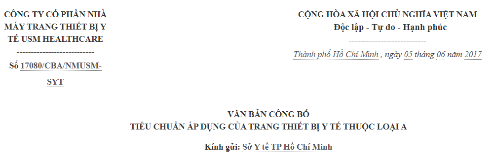 - Tiêu chuẩn chất lượng sản phẩm áp dụng: TCCS 0015:2017/USM
