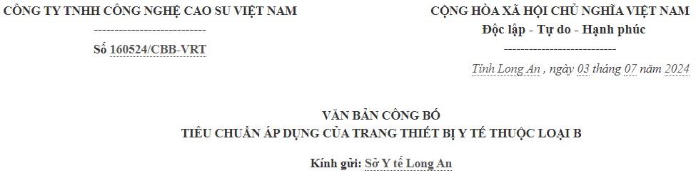 - Tiêu chuẩn chất lượng sản phẩm áp dụng: ISO 13485:2016, TCCS 19:2024/VRT