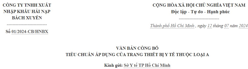 Ngày 20/09/2024 - 11:09Trang thiết bị y tế công bố tiêu chuẩn áp dụng: