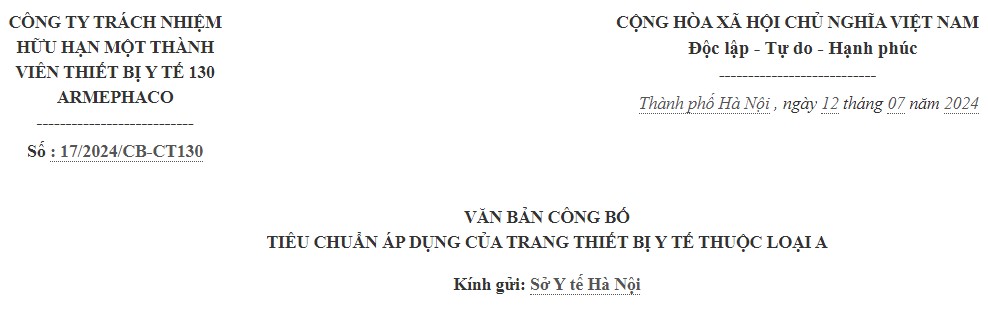 Ngày 13/09/2024 - 08:09Trang thiết bị y tế công bố tiêu chuẩn áp dụng: