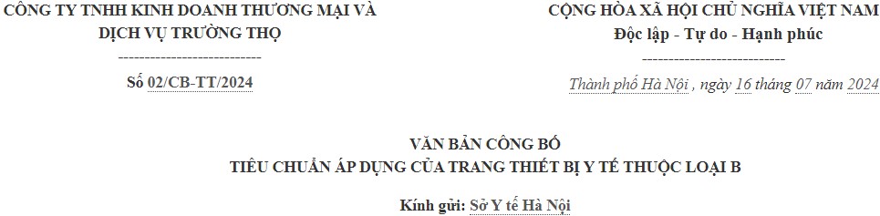 Ngày 20/09/2024 - 11:09Trang thiết bị y tế công bố tiêu chuẩn áp dụng: