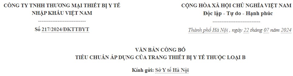 Ngày 13/09/2024 - 01:09Trang thiết bị y tế công bố tiêu chuẩn áp dụng: