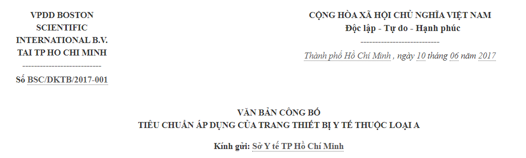 - Loại trang thiết bị y tế: TTBYT Loại A